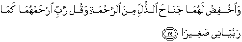 24. Dan rendahkanlah dirimu terhadap mereka berdua dengan penuh kesayangan dan ucapkanlah: "Wahai Tuhanku, kasihilah mereka keduanya, sebagaimana mereka berdua telah mendidik aku waktu kecil."