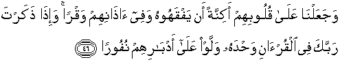 46. dan Kami adakan tutupan di atas hati mereka dan sumbatan di telinga mereka, agar mereka tidak dapat memahaminya. Dan apabila kamu menyebut Tuhanmu saja dalam Al Quran, niscaya mereka berpaling ke belakang karena bencinya,