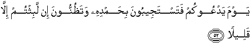 52. yaitu pada hari Dia memanggil kamu, lalu kamu mematuhi-Nya sambil memuji-Nya dan kamu mengira, bahwa kamu tidak berdiam (di dalam kubur) kecuali sebentar saja.