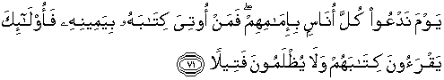 71. (Ingatlah) suatu hari (yang di hari itu) Kami panggil tiap umat dengan pemimpinnya; dan barangsiapa yang diberikan kitab amalannya di tangan kanannya maka mereka ini akan membaca kitabnya itu, dan mereka tidak dianiaya sedikitpun.