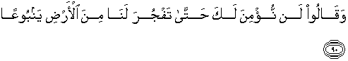 90. Dan mereka berkata: "Kami sekali-kali tidak percaya kepadamu hingga kamu memancarkan mata air dan bumi untuk kami,