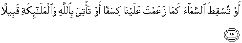 92. atau kamu jatuhkan langit berkeping-keping atas kami, sebagaimana kamu katakan atau kamu datangkan Allah dan malaikat-malaikat berhadapan muka dengan kami.