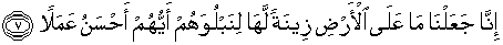 7. Sesungguhnya Kami telah menjadikan apa yang di bumi sebagai perhiasan baginya, agar Kami menguji mereka siapakah di antara mereka yang terbaik perbuatannya.
