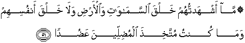 51. Aku tidak menghadirkan mereka (iblis dan anak cucunya) untuk menyaksikan penciptaan langit dan bumi dan tidak (pula) penciptaan diri mereka sendiri; dan tidaklah Aku mengambil orang-orang yang menyesatkan itu sebagai penolong.