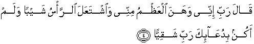 4. Ia berkata "Ya Tuhanku, sesungguhnya tulangku telah lemah dan kepalaku telah ditumbuhi uban, dan aku belum pernah kecewa dalam berdoa kepada Engkau, ya Tuhanku.