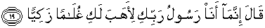 19. Ia (jibril) berkata: "Sesungguhnya aku ini hanyalah seorang utusan Tuhanmu, untuk memberimu seorang anak laki-laki yang suci."