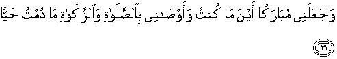 31. dan Dia menjadikan aku seorang yang diberkati di mana saja aku berada, dan Dia memerintahkan kepadaku (mendirikan) shalat dan (menunaikan) zakat selama aku hidup;