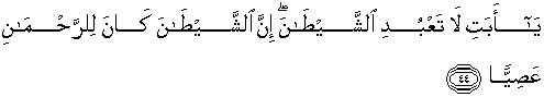 44. Wahai bapakku, janganlah kamu menyembah syaitan. Sesungguhnya syaitan itu durhaka kepada Tuhan Yang Maha Pemurah.