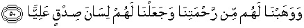 50. Dan Kami anugerahkan kepada mereka sebagian dari rahmat Kami dan Kami jadikan mereka buah tutur yang baik lagi tinggi.