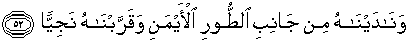 52. Dan Kami telah memanggilnya dari sebelah kanan gunung Thur dan Kami telah mendekatkannya kepada Kami di waktu dia munajat (kepada Kami).