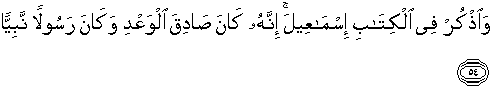 54. Dan ceritakanlah (hai Muhammad kepada mereka) kisah Ismail (yang tersebut) di dalam Al Quran. Sesungguhnya ia adalah seorang yang benar janjinya, dan dia adalah seorang rasul dan nabi.