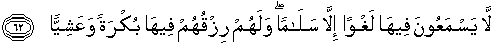 62. Mereka tidak mendengar perkataan yang tak berguna di dalam syurga, kecuali ucapan salam. Bagi mereka rezkinya di syurga itu tiap-tiap pagi dan petang.