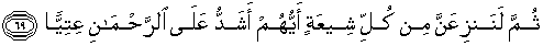 69. Kemudian pasti akan Kami tarik dari tiap-tiap golongan siapa di antara mereka yang sangat durhaka kepada Tuhan Yang Maha Pemurah.