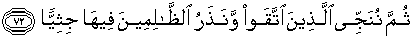 72. Kemudian Kami akan menyelamatkan orang-orang yang bertakwa dan membiarkan orang-orang yang zalim di dalam neraka dalam keadaan berlutut.