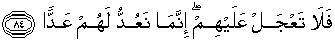 84. maka janganlah kamu tergesa-gesa memintakan siksa terhadap mereka, karena sesungguhnya Kami hanya menghitung datangnya (hari siksaan) untuk mereka dengan perhitungan yang teliti.