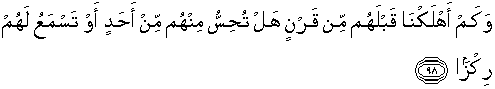 98. Dan berapa banyak telah Kami binasakan umat-umat sebelum mereka. Adakah kamu melihat seorangpun dari mereka atau kamu dengar suara mereka yang samar-samar?