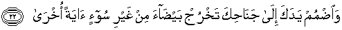 22. dan kepitkanlah tanganmu ke ketiakmu, niscaya ia ke luar menjadi putih cemerlang tanpa cacad, sebagai mukjizat yang lain (pula),