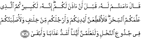 71. Berkata Fir'aun: "Apakah kamu telah beriman kepadanya (Musa)