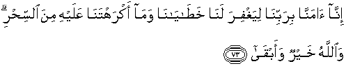 73. Sesungguhnya kami telah beriman kepada Tuhan kami, agar Dia mengampuni kesalahan-kesalahan kami dan sihir yang telah kamu paksakan kepada kami melakukannya. Dan Allah lebih baik (pahala-Nya) dan lebih kekal (azab-Nya)."