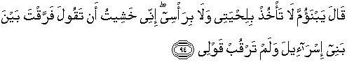 94. Harun menjawab' "Hai putera ibuku, janganlah kamu pegang janggutku dan jangan (pula) kepalaku; sesungguhnya aku khawatir bahwa kamu akan berkata (kepadaku): "Kamu telah memecah antara Bani Israil dan kamu tidak memelihara amanatku."
