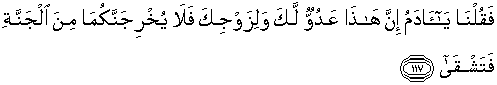 117. Maka Kami berkata: "Hai Adam, sesungguhnya ini (iblis) adalah musuh bagimu dan bagi isterimu, maka sekali-kali janganlah sampai ia mengeluarkan kamu berdua dari surga, yang menyebabkan kamu menjadi celaka.
