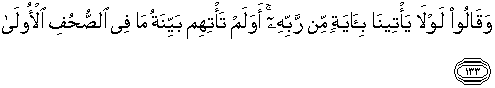 133. Dan mereka berkata: "Mengapa ia tidak membawa bukti kepada kami dari Tuhannya?" Dan apakah belum datang kepada mereka bukti yang nyata dari apa yang tersebut di dalam kitab-kitab yang dahulu?