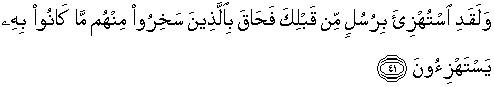 41. Dan sungguh telah diperolok-olokkan beberapa orang rasul sebelum kamu maka turunlah kepada orang yang mencemoohkan rasul-rasul itu azab yang selalu mereka perolok-olokkan.