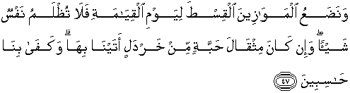 47. Kami akan memasang timbangan yang tepat pada hari kiamat, maka tiadalah dirugikan seseorang barang sedikitpun. Dan jika (amalan itu) hanya seberat biji sawipun pasti Kami mendatangkan (pahala)nya. Dan cukuplah Kami sebagai pembuat perhitungan.