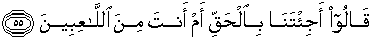 55. Mereka menjawab: "Apakah kamu datang kepada kami dengan sungguh-sungguh ataukah kamu termasuk orang-orang yang bermain-main