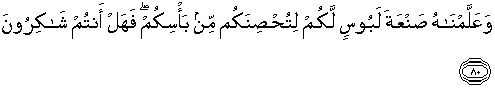 80. Dan telah Kami ajarkan kepada Daud membuat baju besi untuk kamu, guna memelihara kamu dalam peperanganmu; Maka hendaklah kamu bersyukur (kepada Allah).