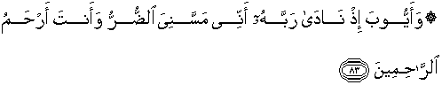 83. dan (ingatlah kisah) Ayub, ketika ia menyeru Tuhannya: "(Ya Tuhanku), sesungguhnya aku telah ditimpa penyakit dan Engkau adalah Tuhan Yang Maha Penyayang di antara semua penyayang."
