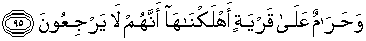 95. Sungguh tidak mungkin atas (penduduk) suatu negeri yang telah Kami binasakan, bahwa mereka tidak akan kembali (kepada Kami).