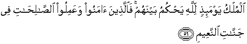 56. Kekuasaan di hari itu ada pada Allah, Dia memberi keputusan di antara mereka. Maka orang-orang yang beriman dan beramal saleh adalah di dalam syurga yang penuh kenikmatan.
