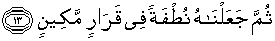 13. Kemudian Kami jadikan saripati itu air mani (yang disimpan) dalam tempat yang kokoh (rahim).