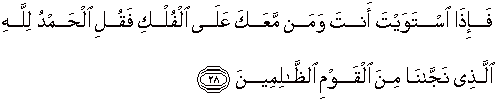 28. Apabila kamu dan orang-orang yang bersamamu telah berada di atas bahtera itu, maka ucapkanlah: "Segala puji bagi Allah yang telah menyelamatkan kami dari orang-orang yang zalim."