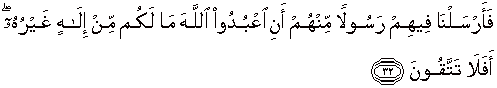 32. Lalu Kami utus kepada mereka, seorang rasul dari kalangan mereka sendiri (yang berkata): "Sembahlah Allah oleh kamu sekalian, sekali-kali tidak ada Tuhan selain daripada-Nya. Maka mengapa kamu tidak bertakwa (kepada-Nya).