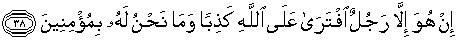 38. Ia tidak lain hanyalah seorang yang mengada-adakan kebohongan terhadap Allah, dan kami sekali-kali tidak akan beriman kepadanya."