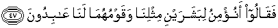 47. Dan mereka berkata: "Apakah (patut) kita percaya kepada dua orang manusia seperti kita (juga), padahal kaum mereka (Bani Israil) adalah orang-orang yang menghambakan diri kepada kita?"