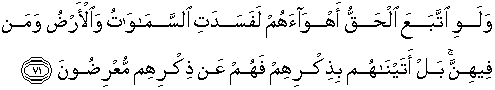 71. Andaikata kebenaran itu menuruti hawa nafsu mereka, pasti binasalah langit dan bumi ini, dan semua yang ada di dalamnya. Sebenarnya Kami telah mendatangkan kepada mereka kebanggaan (Al Quran) mereka tetapi mereka berpaling dari kebanggaan itu.