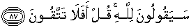 87. Mereka akan menjawab: "Kepunyaan Allah." Katakanlah: "Maka apakah kamu tidak bertakwa?"