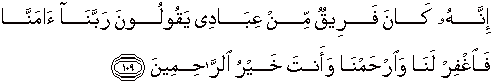 109. Sesungguhnya, ada segolongan dari hamba-hamba-Ku berdoa (di dunia): "Ya Tuhan kami, kami telah beriman, maka ampunilah kami dan berilah kami rahmat dan Engkau adalah Pemberi rahmat Yang Paling Baik.