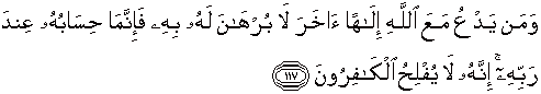 117. Dan barangsiapa menyembah tuhan yang lain di samping Allah, padahal tidak ada suatu dalilpun baginya tentang itu, maka sesungguhnya perhitungannya di sisi Tuhannya. Sesungguhnya orang-orang yang kafir itu tiada beruntung.