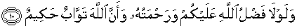 10. Dan andaikata tidak ada kurnia Allah dan rahmat-Nya atas dirimu dan (andaikata) Allah bukan Penerima Taubat lagi Maha Bijaksana, (niscaya kamu akan mengalami kesulitan-kesulitan).