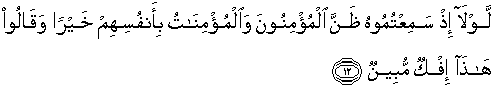 12. Mengapa di waktu kamu mendengar berita bohon itu orang-orang mukminin dan mukminat tidak bersangka baik terhadap diri mereka sendiri, dan (mengapa tidak) berkata: "Ini adalah suatu berita bohong yang nyata."