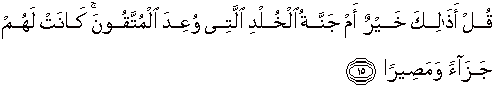 15. Katakanlah: "Apa (azab) yang demikian itukah yang baik, atau surga yang kekal yang telah dijanjikan kepada orang-orang yang bertaqwa?" Dia menjadi balasan dan tempat kembali bagi mereka?."