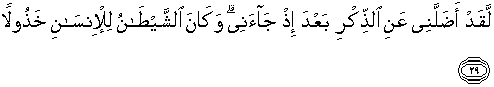 29. Sesungguhnya dia telah menyesatkan aku dari Al Quran ketika Al Quran itu telah datang kepadaku. Dan adalah syaitan itu tidak mau menolong manusia.