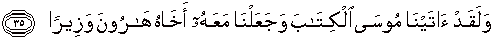 35. Dan sesungguhnya kami telah memberikan Al Kitab (Taurat) kepada Musa dan Kami telah menjadikan Harun saudaranya, menyertai dia sebagai wazir (pembantu).
