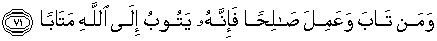 71. Dan orang-orang yang bertaubat dan mengerjakan amal saleh, maka sesungguhnya dia bertaubat kepada Allah dengan taubat yang sebenar-benarnya.
