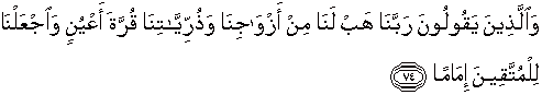 74. Dan orang orang yang berkata: "Ya Tuhan kami, anugrahkanlah kepada kami isteri-isteri kami dan keturunan kami sebagai penyenang hati (kami), dan jadikanlah kami imam bagi orang-orang yang bertakwa.