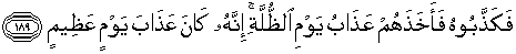 189. Kemudian mereka mendustakan Syu'aib, lalu mereka ditimpa 'azab pada hari mereka dinaungi awan. Sesungguhnya azab itu adalah 'azab hari yang besar.